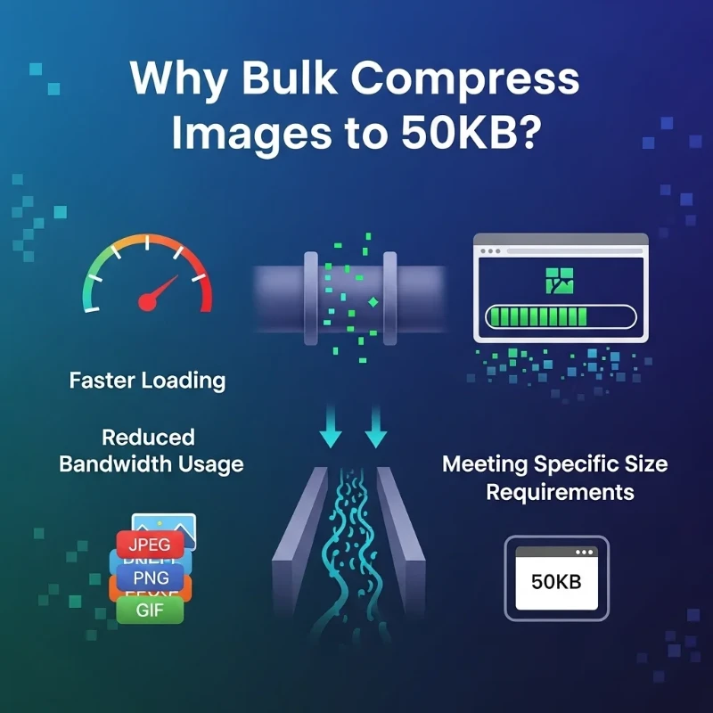 Bulk compressing images to 50KB is ideal when you need lightweight files for faster loading, reduced bandwidth usage, and meeting specific size requirements across multiple images.